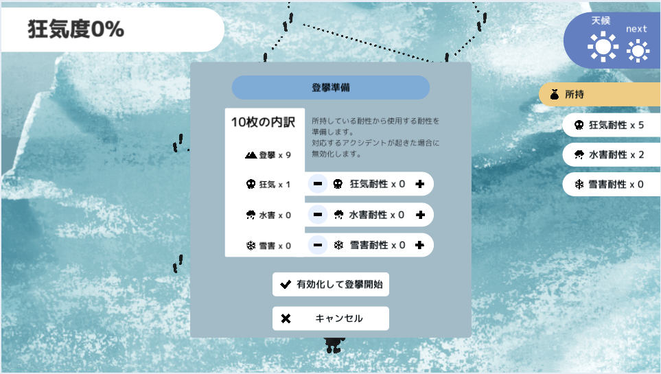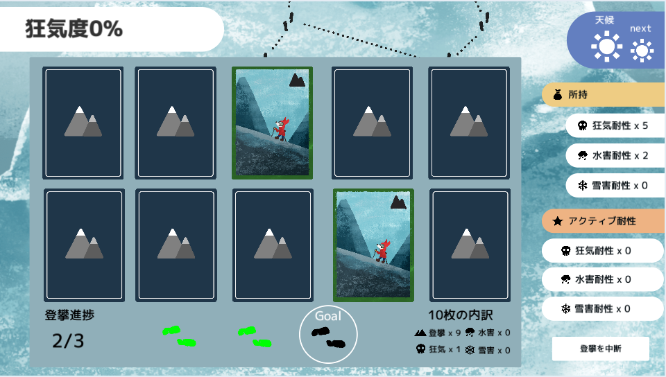 進捗カードとアクシデントカードが混ざっているので、進捗カードをうまく引いて、登山を成功させてください。