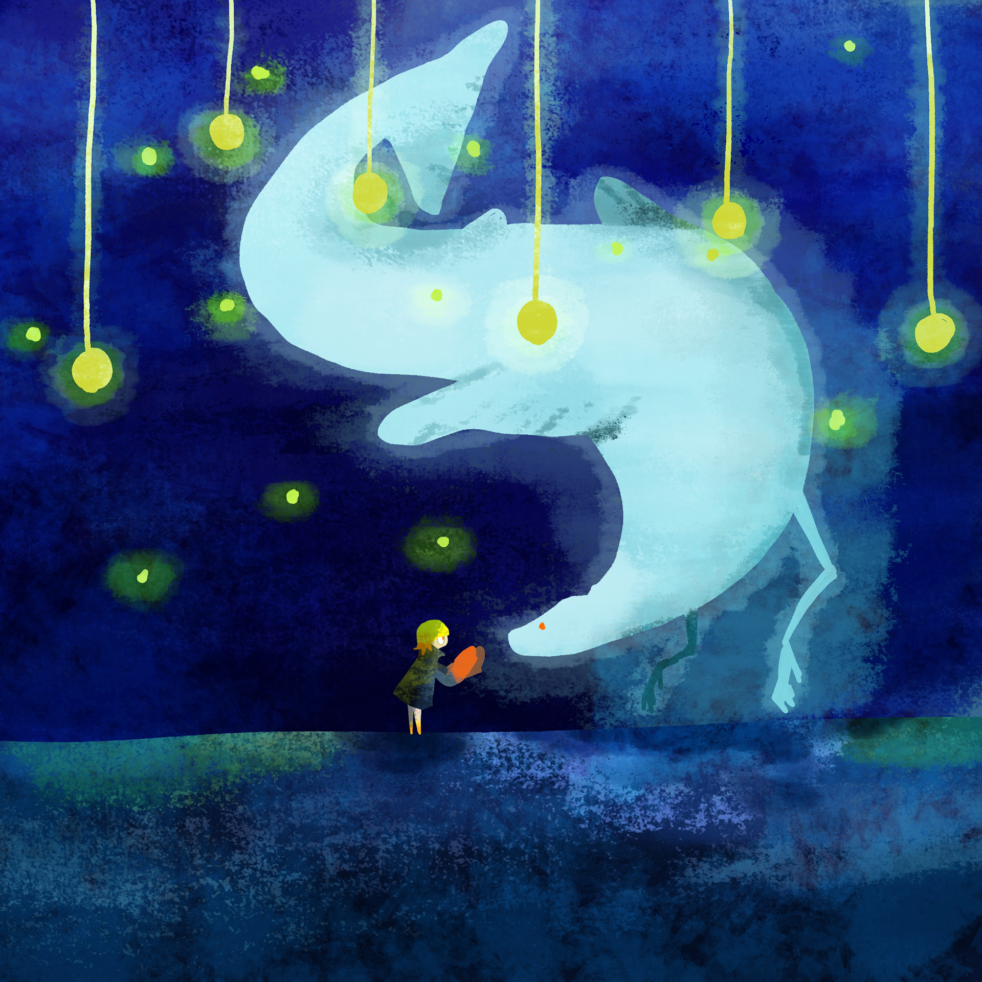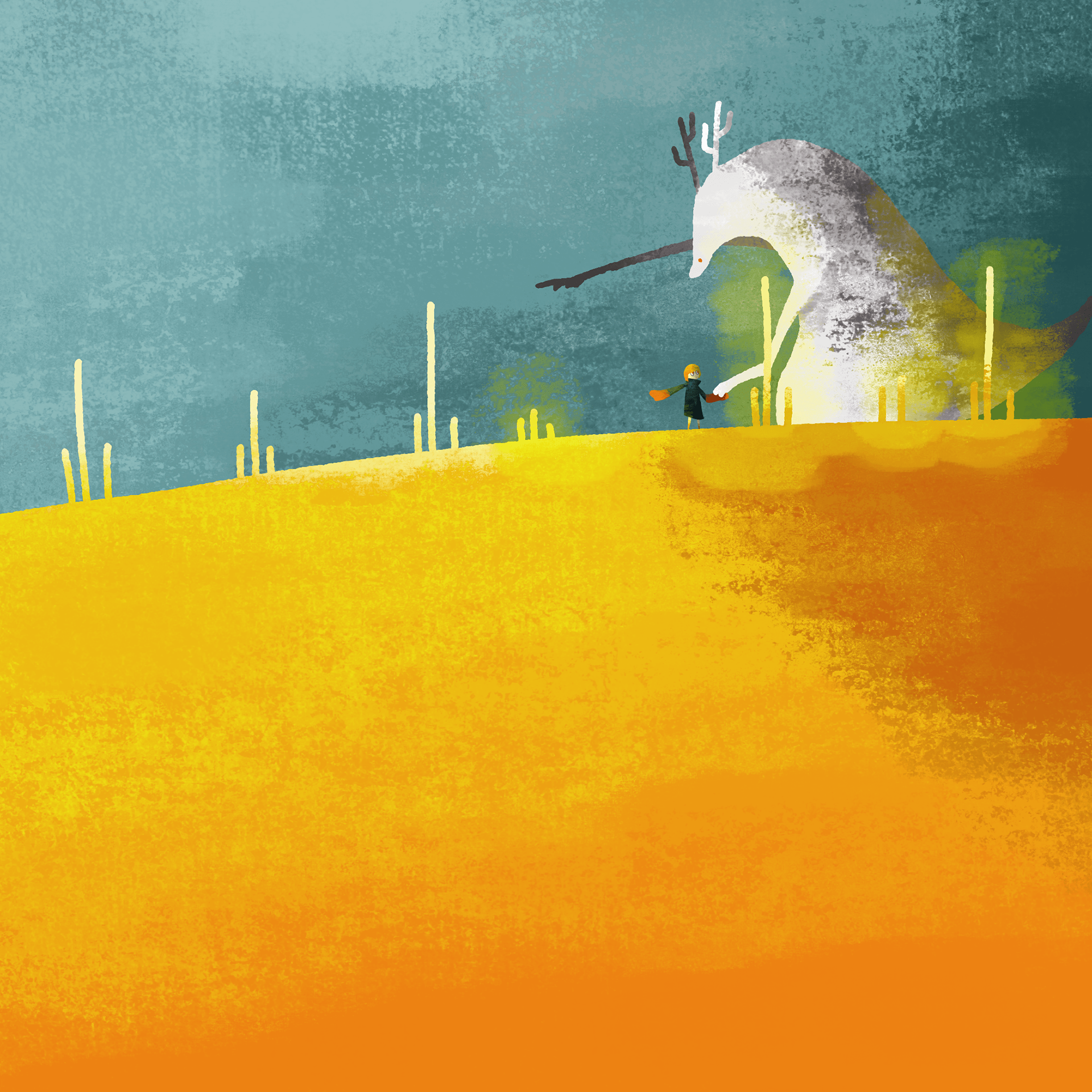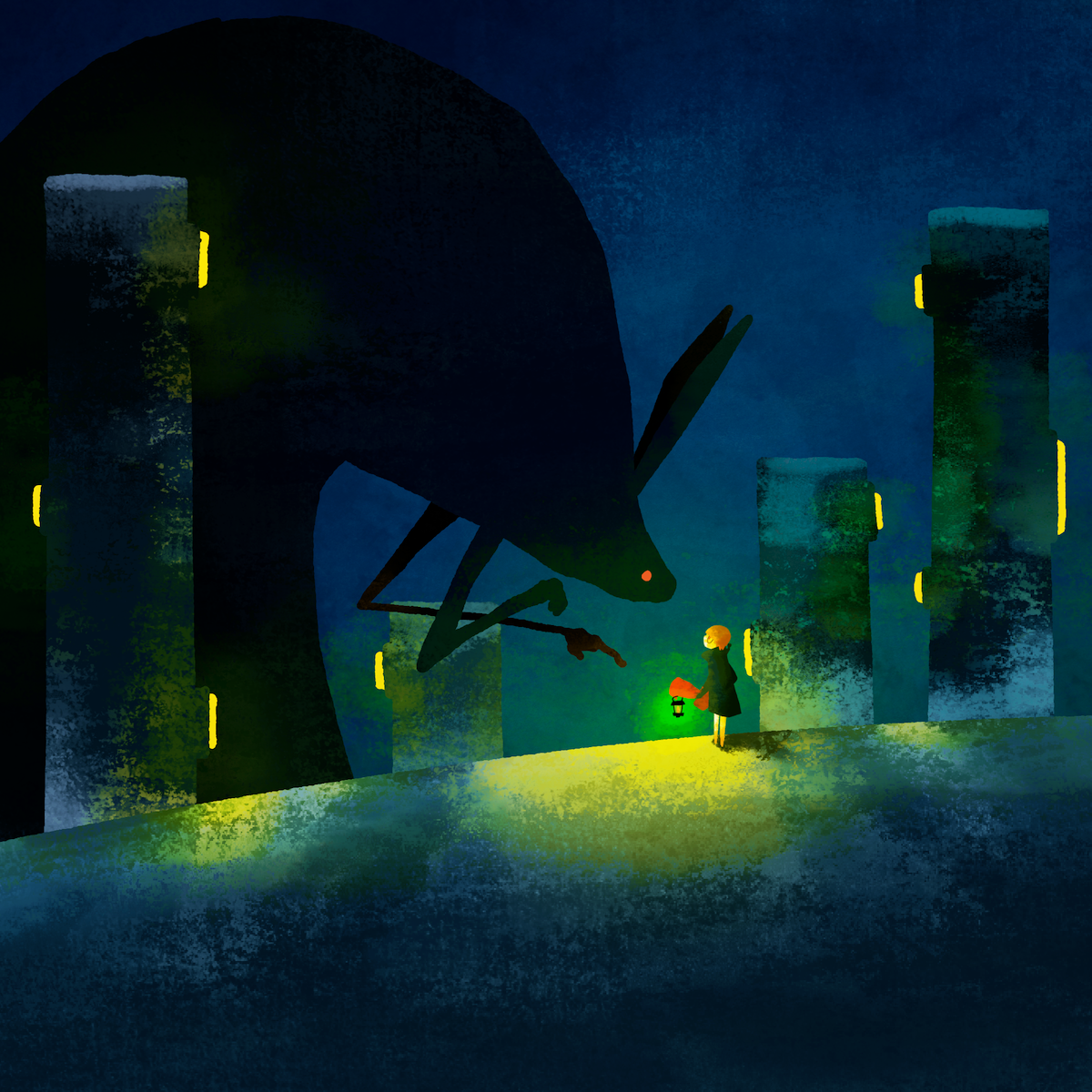 ひとりで旅をするヨミを見守る大きな生き物たち。