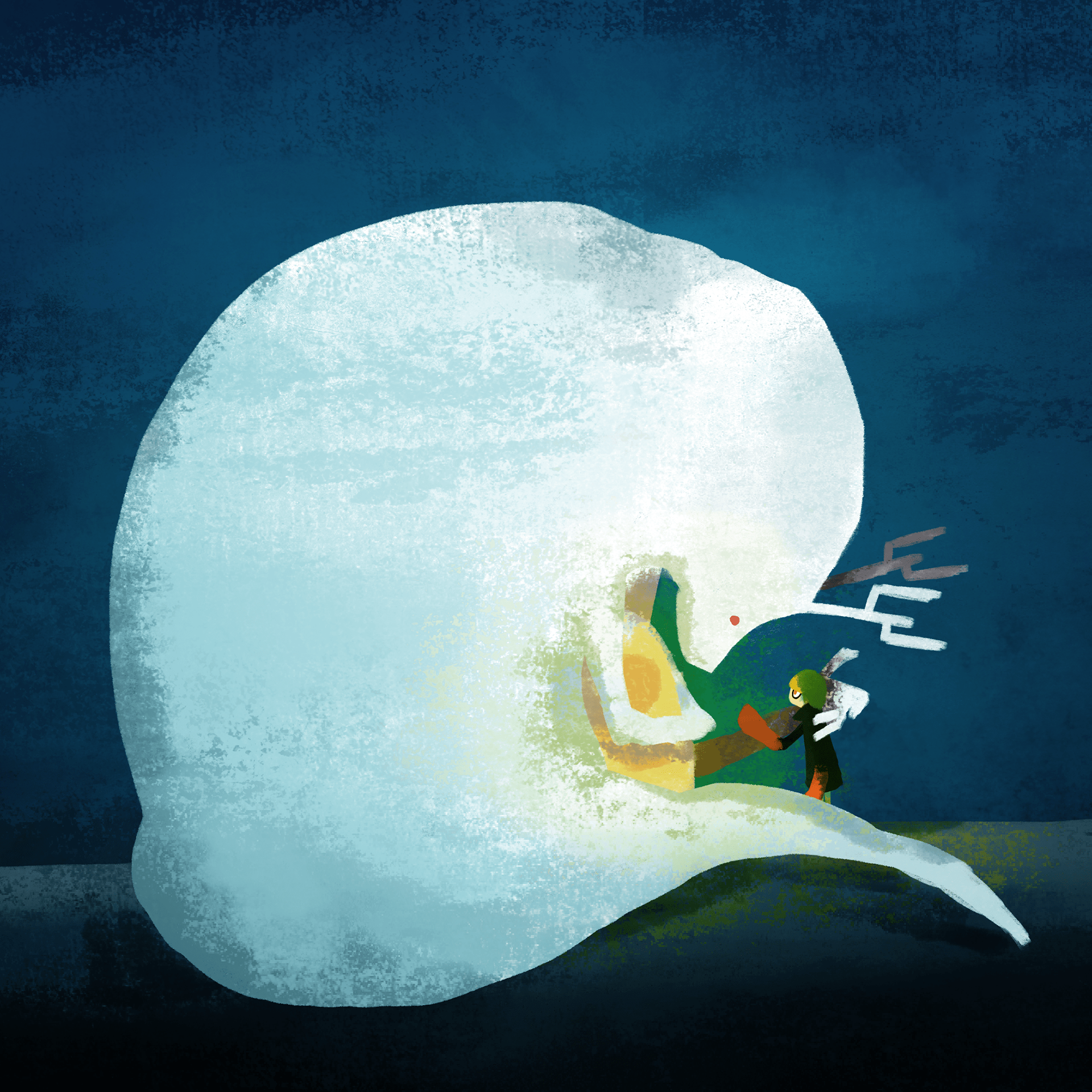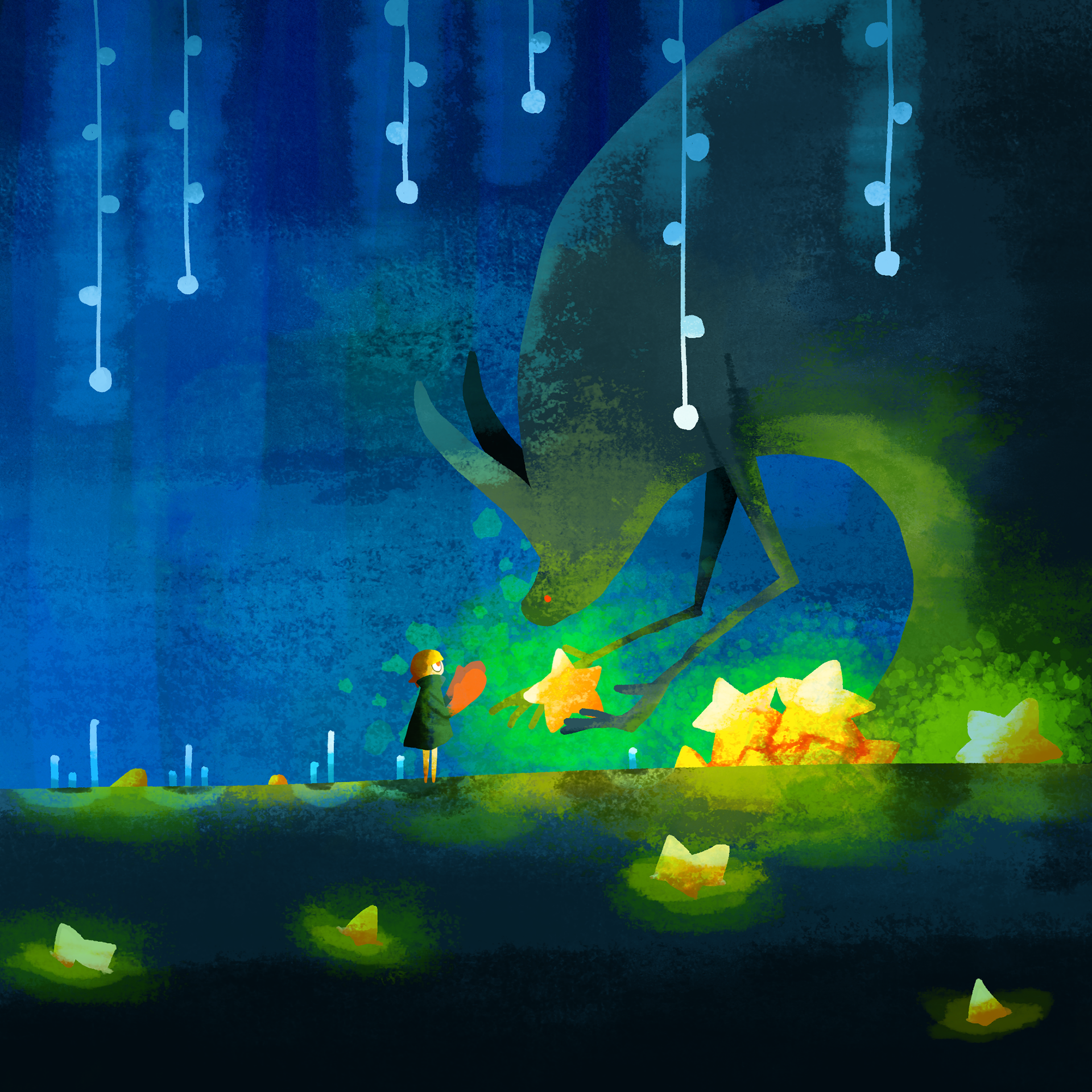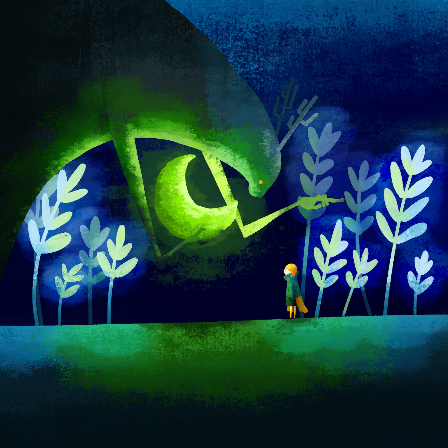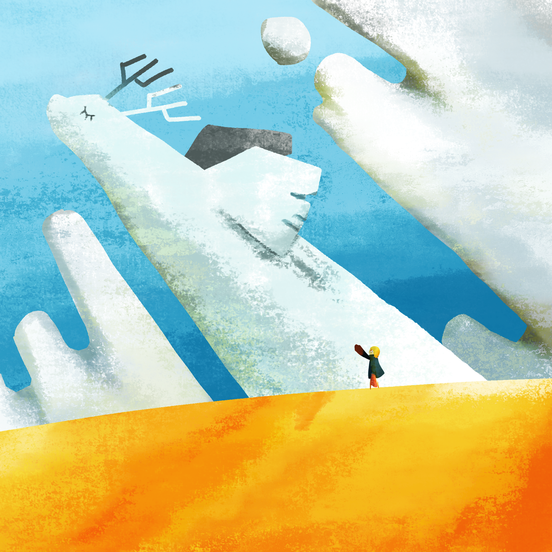 ひとりで旅をするヨミを見守る大きな生き物たち。