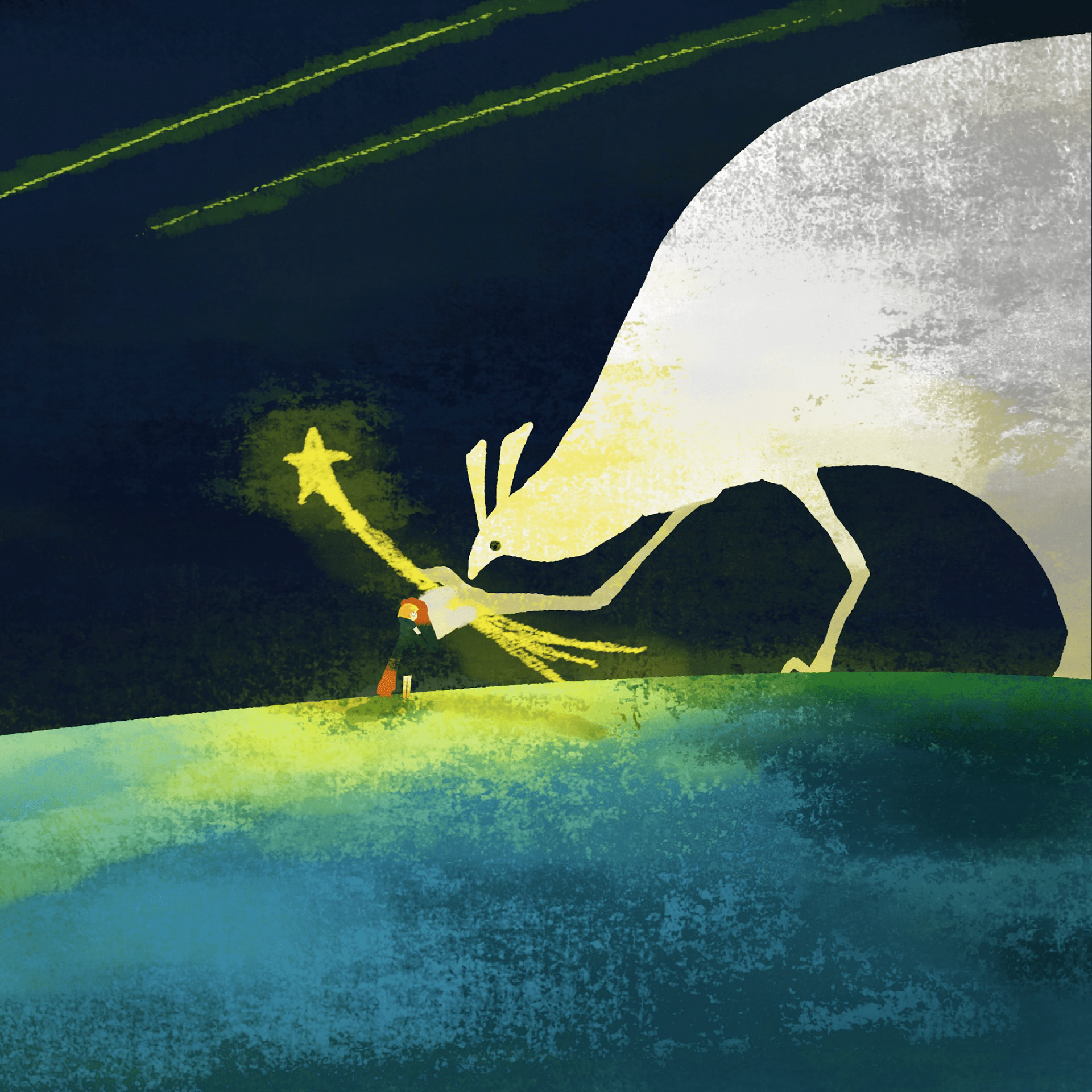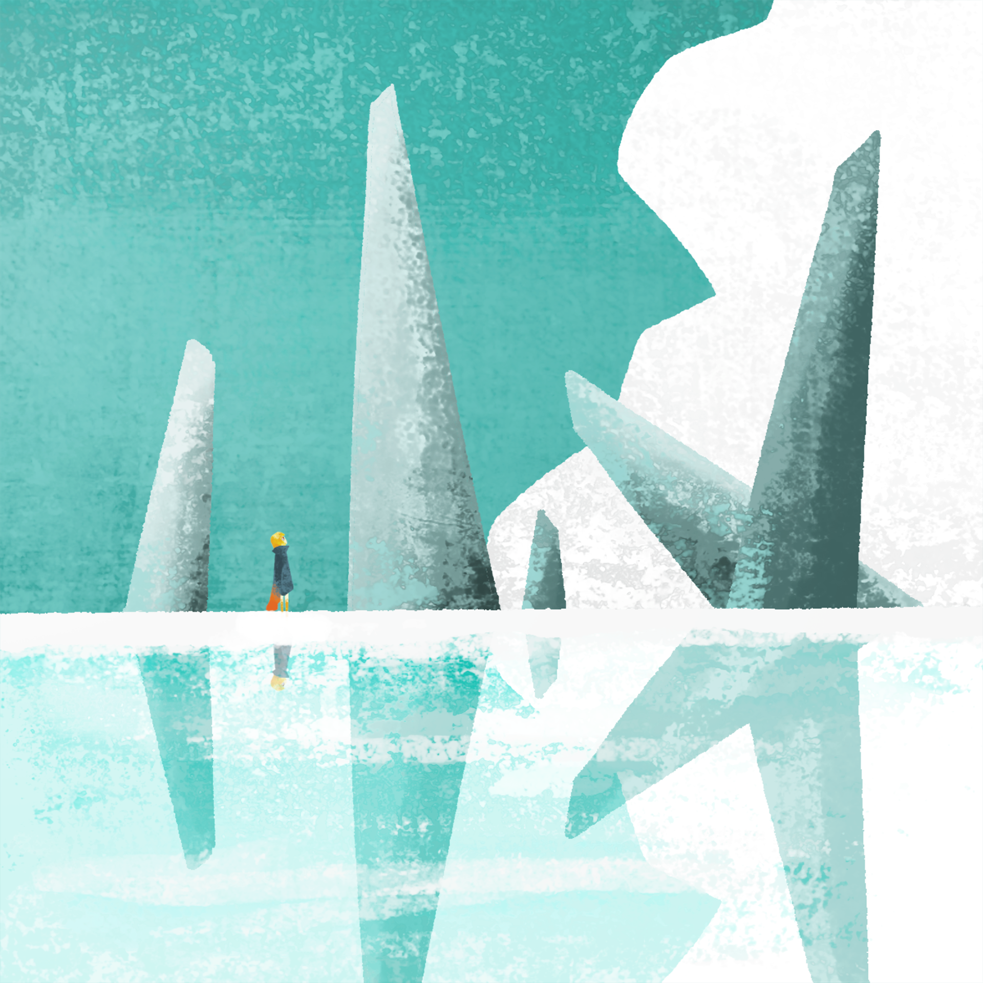 She journeys alone, watched over by gentle, giant creatures.